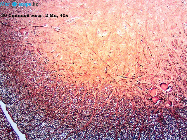 Рассматривая спинной мозг под микроскопом, можно только очарованно вздохнуть. Это действительно очень красиво, но попробуем разобраться, что есть что. Для начала вспомним, в чем состоит функция спинного мозга. В первую очередь - это передача информации о том, что происходит с организмом, а также передача команд, что этому организму дальше делать. Отсюда становится понятной роль каждой из частей спинного мозга. Темная «бабочка» посередине - это серое вещество, здесь расположены нервные клетки, которые и управляют сигналами, приходящими и уходящими к мышцам. При этом сами сигналы передвигаются по нервам -специальным отросткам нервных клеток, которые расположены вокруг «бабочки» и образуют белое вещество.