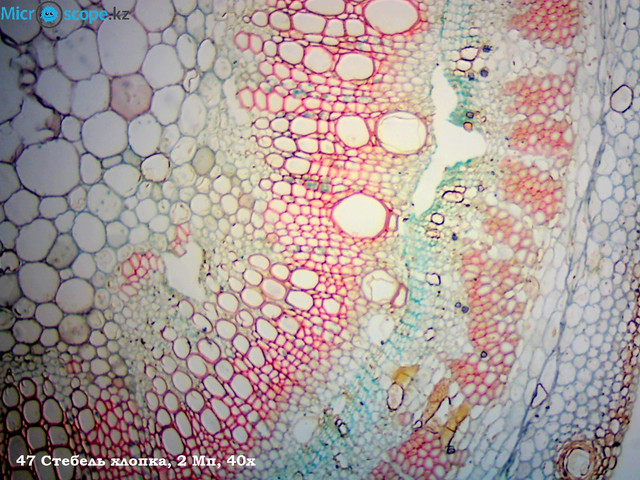 В качестве примера посмотрим, как же устроен стебель хлопка. Снаружи расположена кора - это плотный слой клеток, который призван защищать стебель. Под корой расположены клетки паренхимы или сосудов стебля, которые также отмирают, их задача -проводить воду и минеральные вещества от корня, кроме того, именно они обеспечивают стеблю его прочность. В самом центре корня расположены клетки колленхимы — это живые клетки, которые проводят питательные вещества от листьев. Самое интересное можно найти между двумя слоями клеток - это камбий, тонкий слой клеток, которые постоянно делятся и дают начало сосудам и колленхиме. Именно благодаря ним стебель растет в ширину.